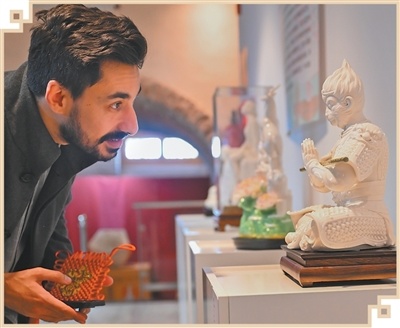 2025年11月11日,一名参观者在西班牙塔拉韦拉文化中心欣赏德化白瓷展品。